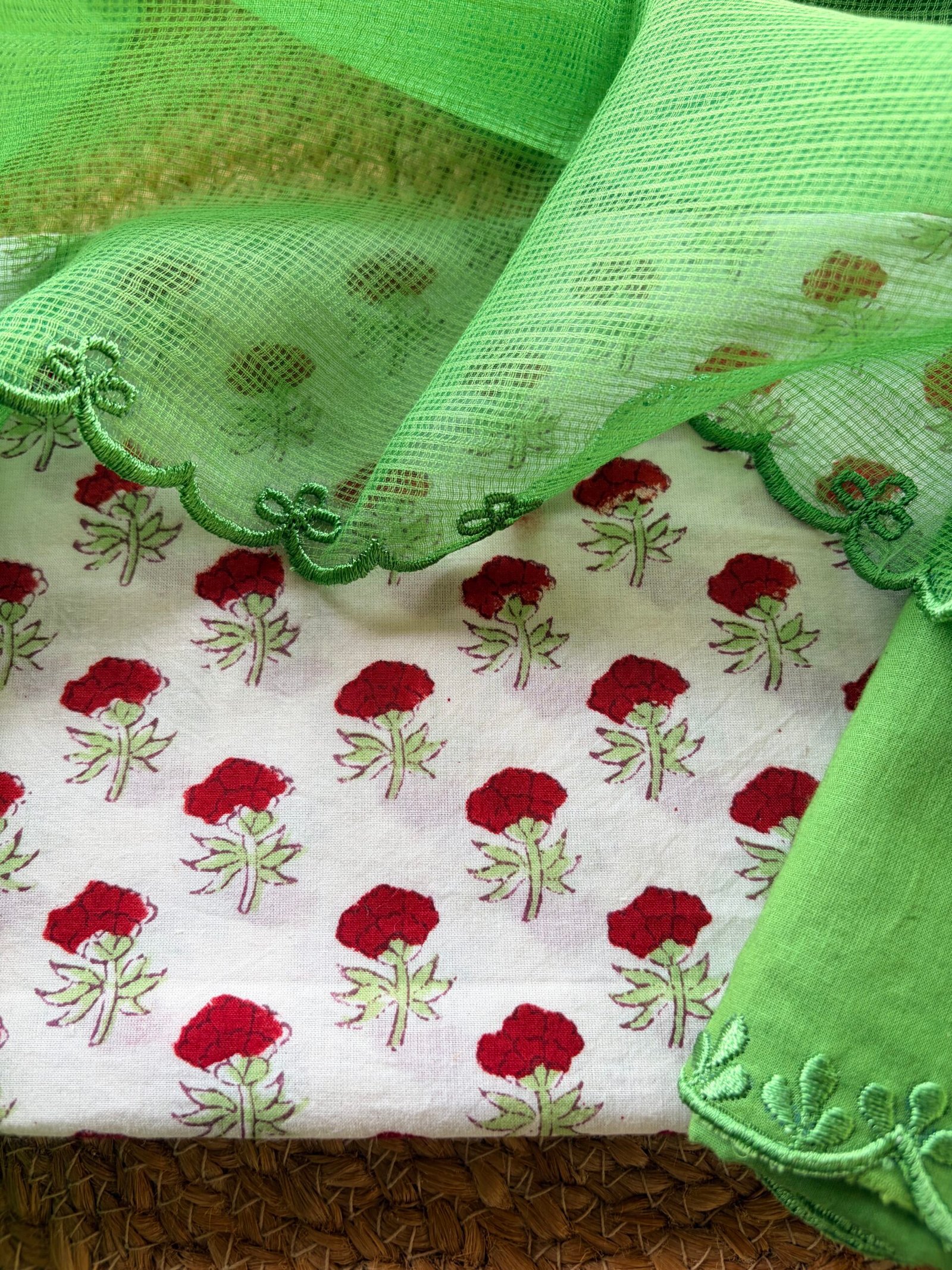 Dupatta: Cotton with embroidery and scallpoed ends