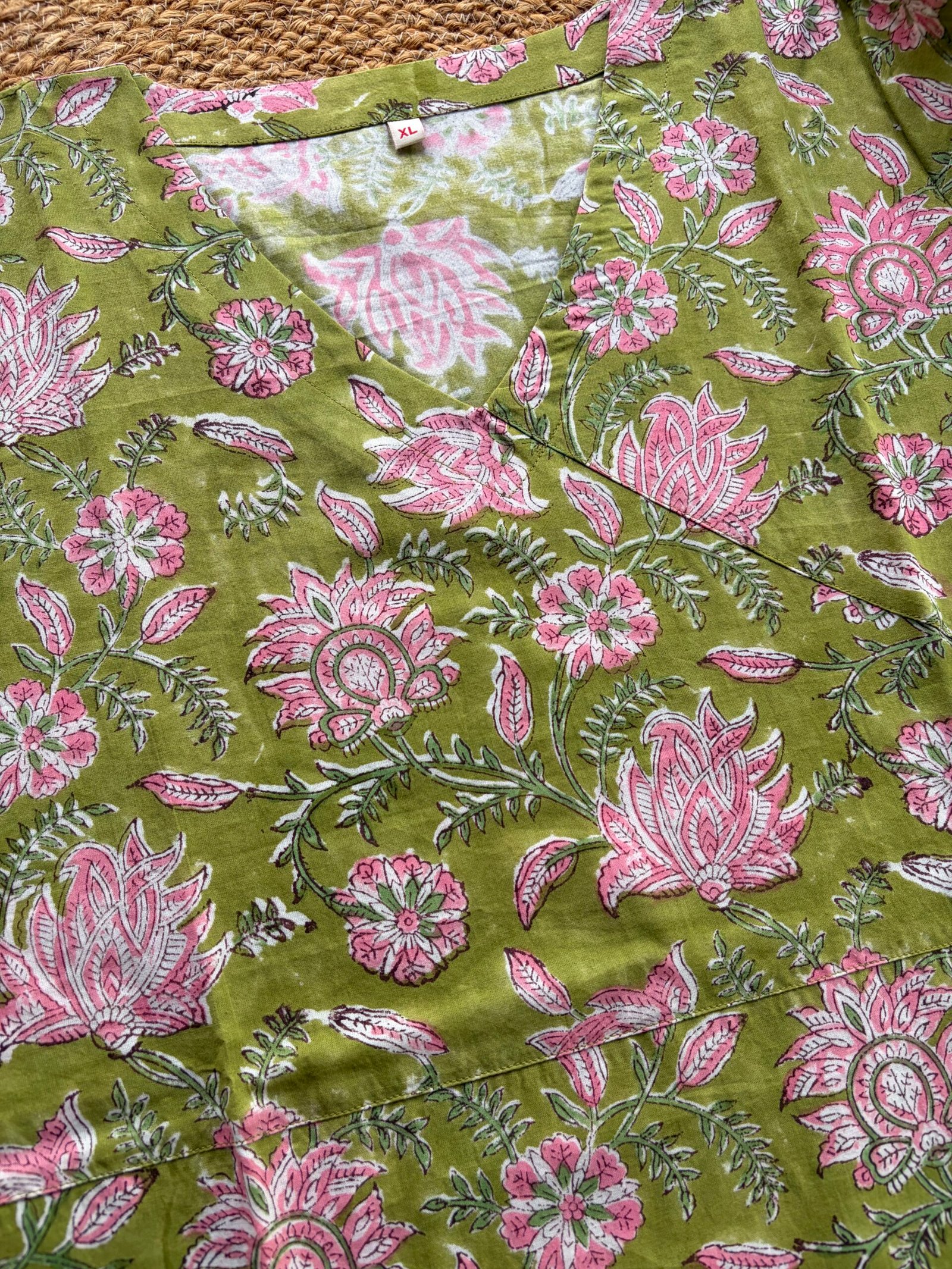 Top: Pure printed cotton top with V neck , straight cut and elbow sleeves size XL is avaliable