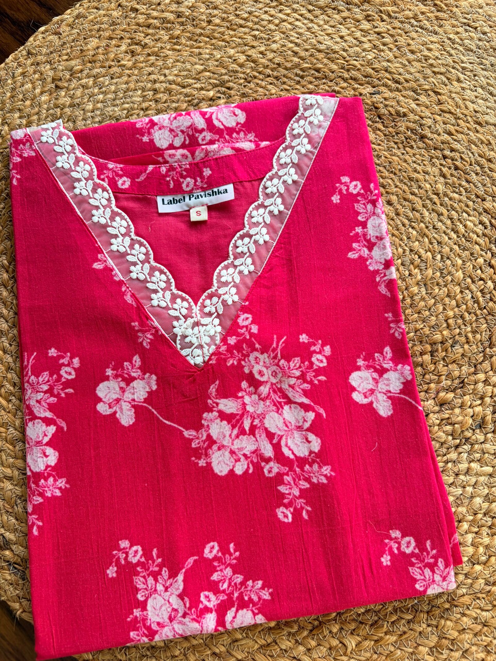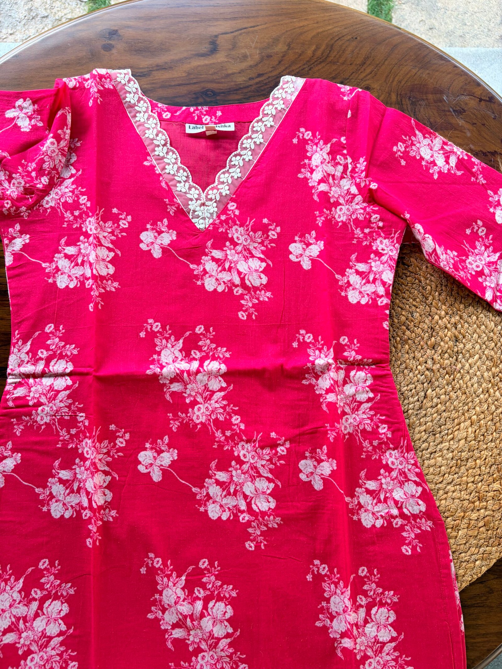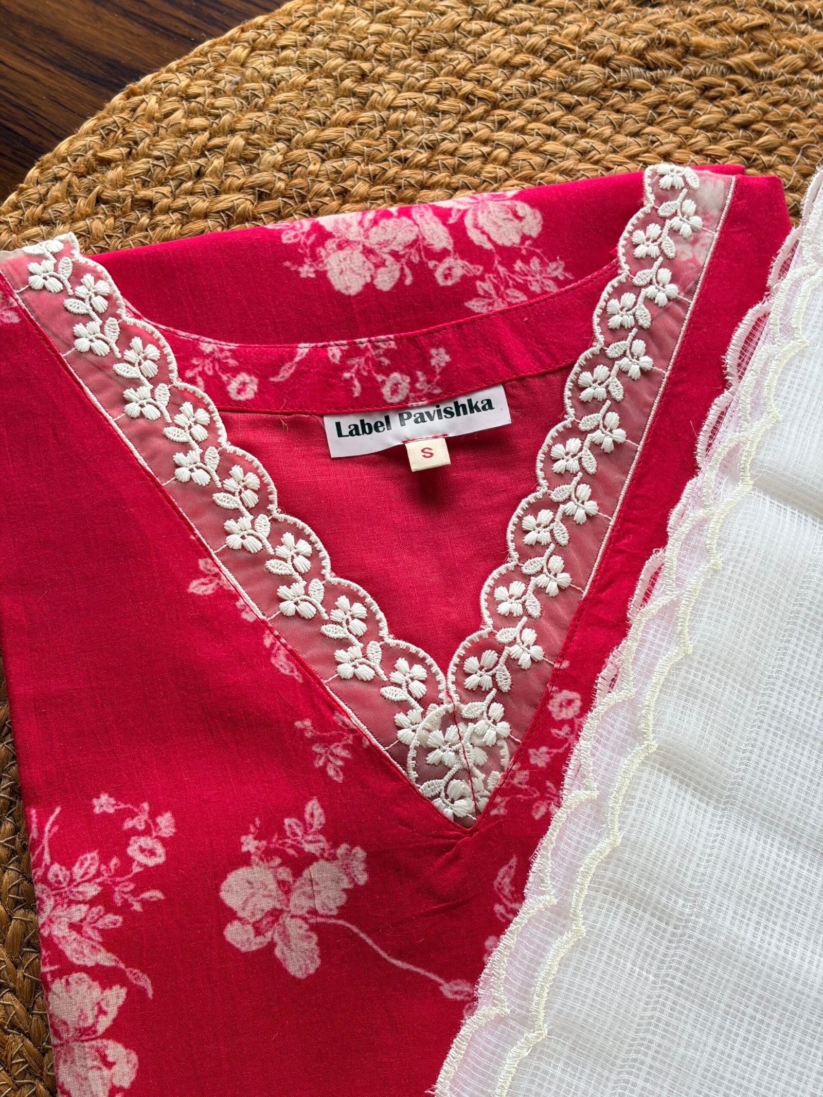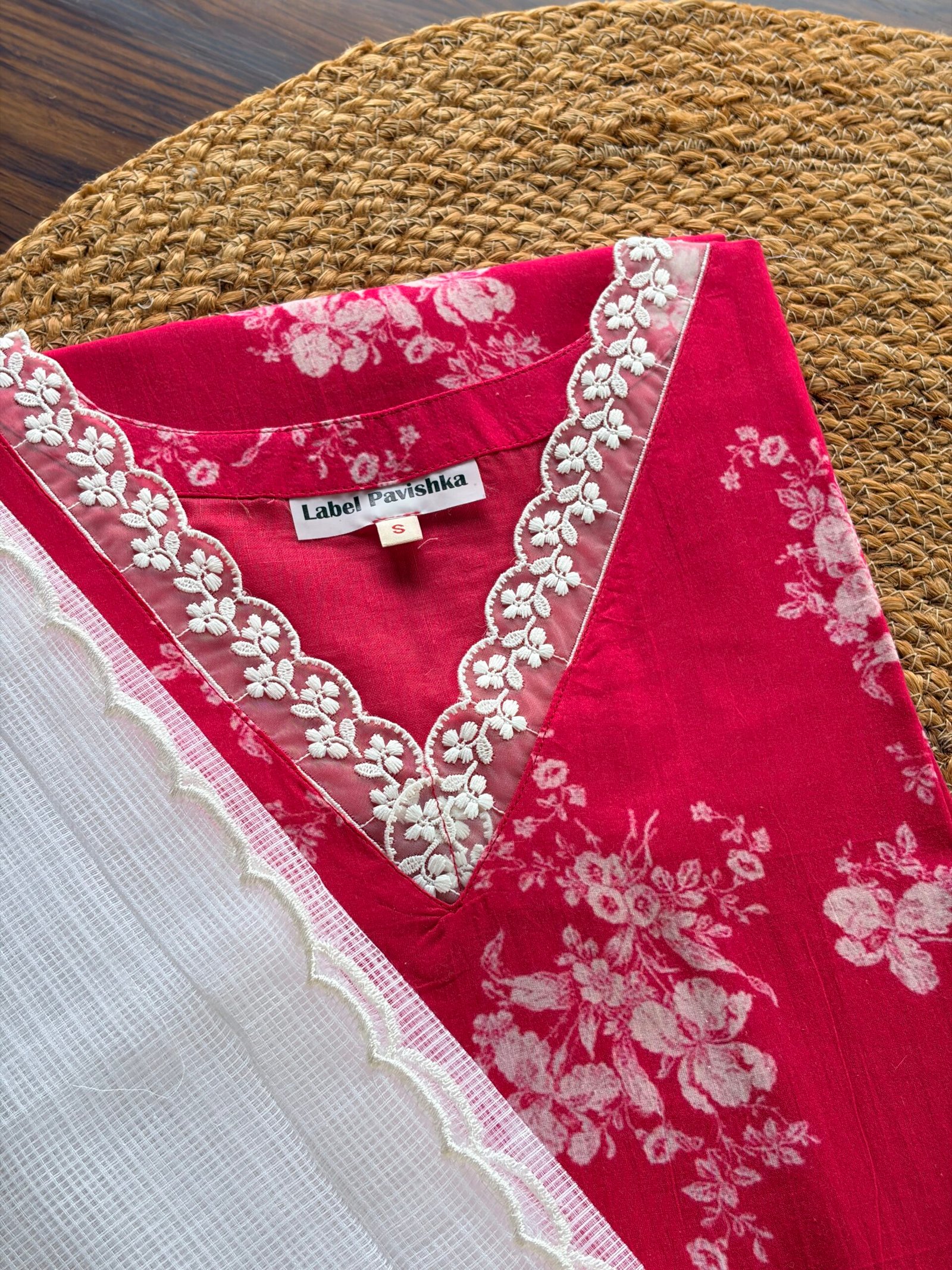 Crimson Bloom pure mul mul kurti in a rich deep red shade, designed for comfort and elegance. It features delicate lace on the neckline, 3/4 sleeves, and soft cotton lining. Paired with a white Kota dupatta with scalloped edges. No bottom included. Sizes available: S, M, L, XL. 🌺